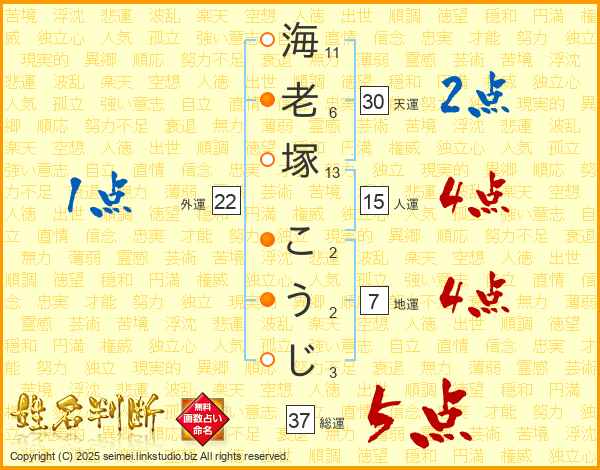 海(11画)老(6画)塚(13画) こ(2画)う(2画)じ(3画)