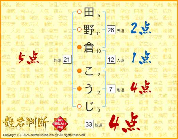 田野倉こうじさんの総運は33画の4点!