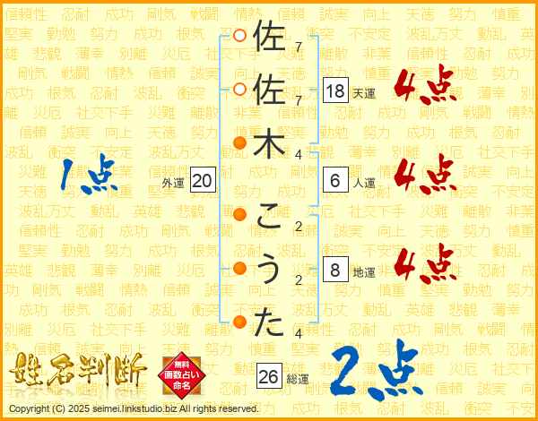 佐佐木こうたさんの総運は26画の2点!