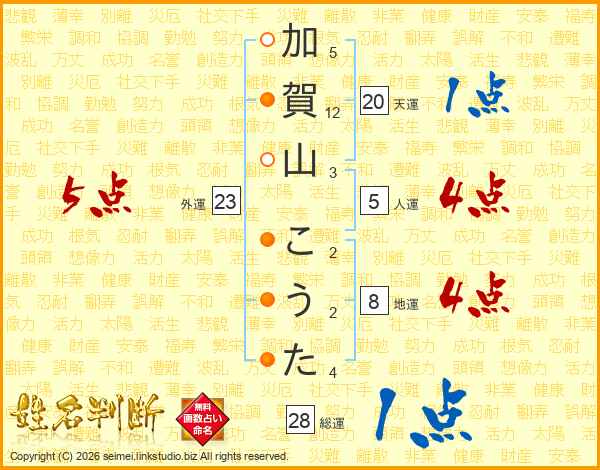 加(5画)賀(12画)山(3画) こ(2画)う(2画)た(4画)