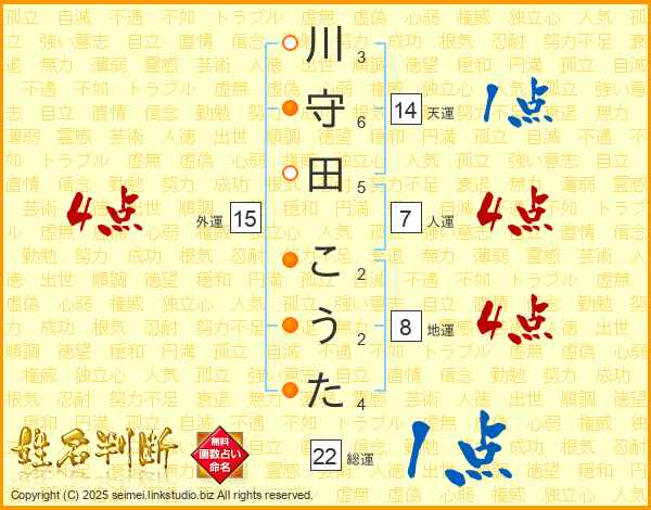 生活面を象徴する運勢です。外部から受ける影響力を表し、結婚運、家庭運や職場、環境への順応性を表します。総運から人運を引いた画数。姓や名が1文字の場合を除く。