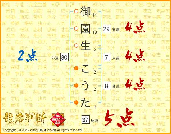 御(11画)園(13画)生(5画) こ(2画)う(2画)た(4画)