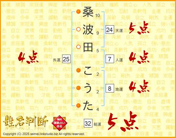 生活面を象徴する運勢です。外部から受ける影響力を表し、結婚運、家庭運や職場、環境への順応性を表します。総運から人運を引いた画数。姓や名が1文字の場合を除く。