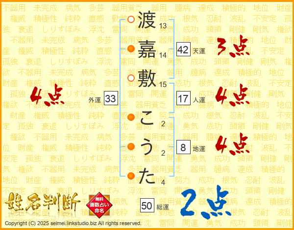 生活面を象徴する運勢です。外部から受ける影響力を表し、結婚運、家庭運や職場、環境への順応性を表します。総運から人運を引いた画数。姓や名が1文字の場合を除く。