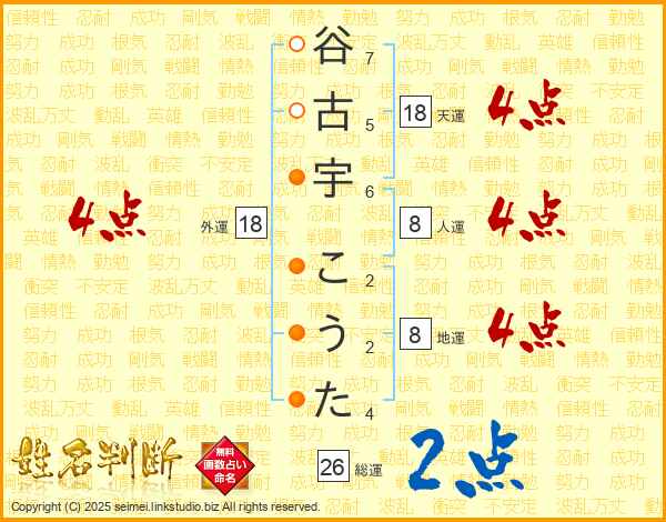 生活面を象徴する運勢です。外部から受ける影響力を表し、結婚運、家庭運や職場、環境への順応性を表します。総運から人運を引いた画数。姓や名が1文字の場合を除く。
