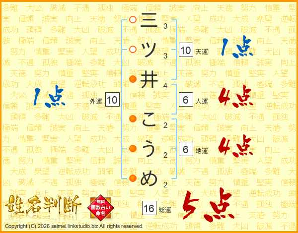 生活面を象徴する運勢です。外部から受ける影響力を表し、結婚運、家庭運や職場、環境への順応性を表します。総運から人運を引いた画数。姓や名が1文字の場合を除く。