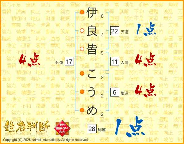 伊良皆こうめさんの外運は17画の4点!