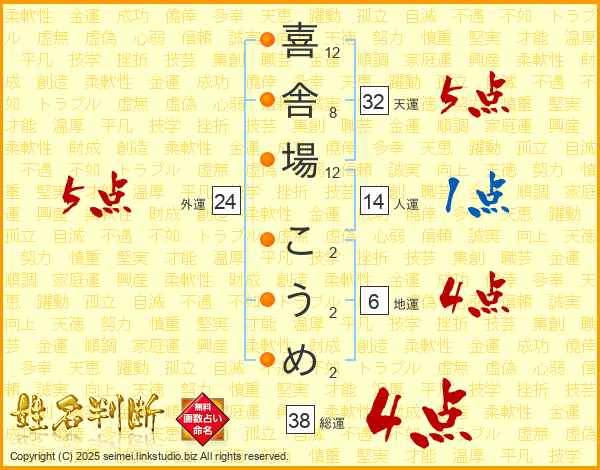 喜(12画)舎(8画)場(12画) こ(2画)う(2画)め(2画)