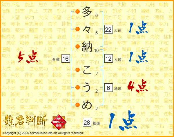 生活面を象徴する運勢です。外部から受ける影響力を表し、結婚運、家庭運や職場、環境への順応性を表します。総運から人運を引いた画数。姓や名が1文字の場合を除く。