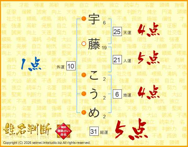 宇(6画)藤(19画) こ(2画)う(2画)め(2画)