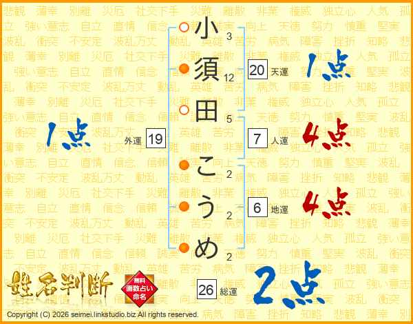 生活面を象徴する運勢です。外部から受ける影響力を表し、結婚運、家庭運や職場、環境への順応性を表します。総運から人運を引いた画数。姓や名が1文字の場合を除く。