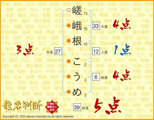 嵯(13画)峨(10画)根(10画) こ(2画)う(2画)め(2画)