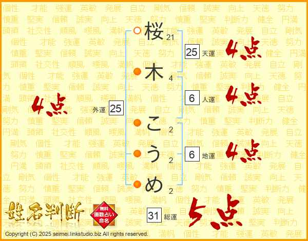 桜(21画)木(4画) こ(2画)う(2画)め(2画)