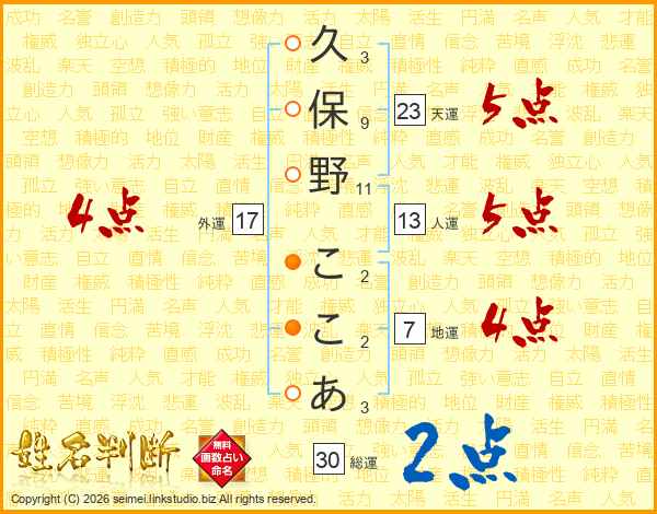 久(3画)保(9画)野(11画) こ(2画)こ(2画)あ(3画)