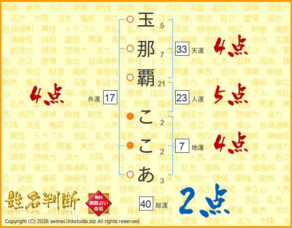 玉(5画)那(7画)覇(21画) こ(2画)こ(2画)あ(3画)