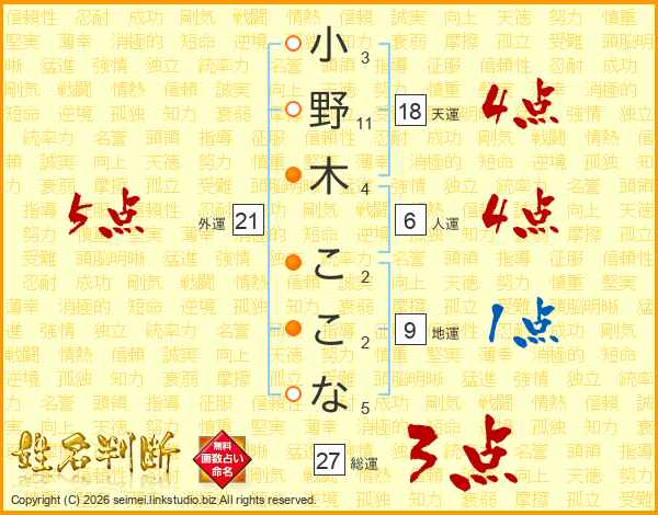 小野木ここなさんの総運は27画の3点!