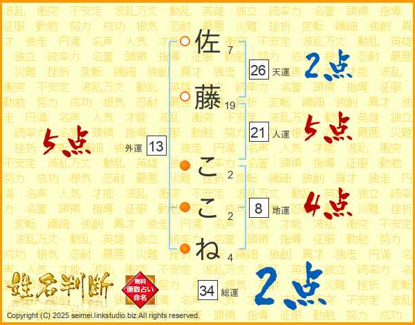 佐(7画)藤(19画) こ(2画)こ(2画)ね(4画)