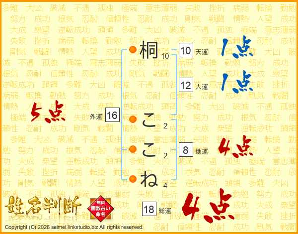 桐(10画) こ(2画)こ(2画)ね(4画)