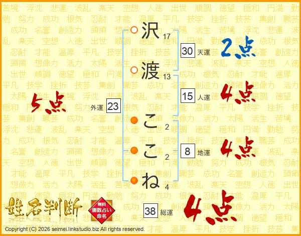 沢(17画)渡(13画) こ(2画)こ(2画)ね(4画)