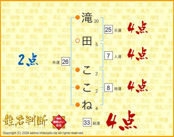 滝田ここねさんの総運は33画の4点!