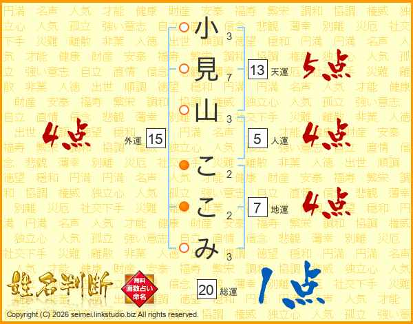 生活面を象徴する運勢です。外部から受ける影響力を表し、結婚運、家庭運や職場、環境への順応性を表します。総運から人運を引いた画数。姓や名が1文字の場合を除く。