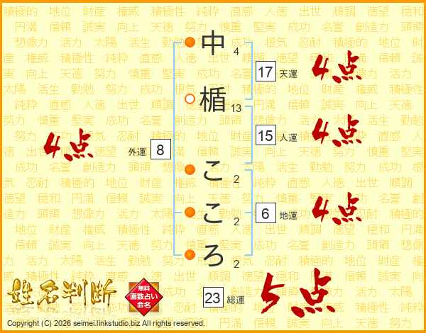 中楯こころさんの総運は23画の5点!
