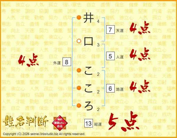 生活面を象徴する運勢です。外部から受ける影響力を表し、結婚運、家庭運や職場、環境への順応性を表します。総運から人運を引いた画数。姓や名が1文字の場合を除く。