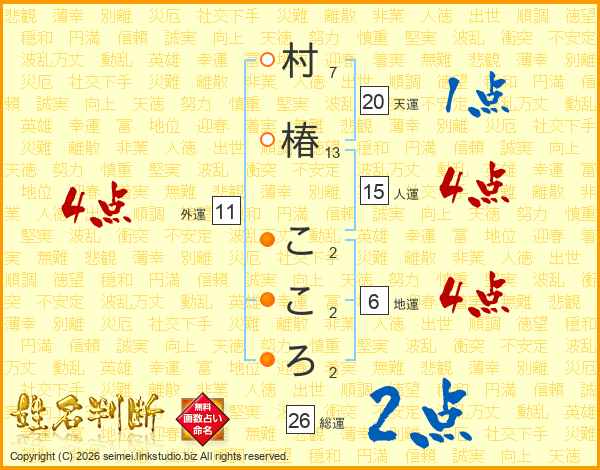 村(7画)椿(13画) こ(2画)こ(2画)ろ(2画)