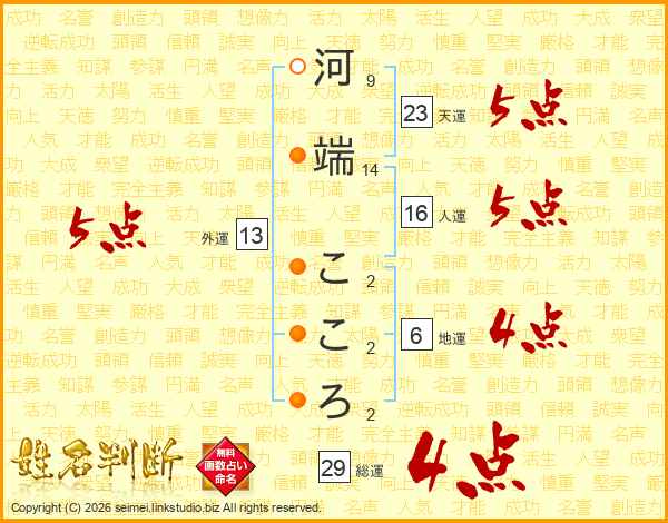 生活面を象徴する運勢です。外部から受ける影響力を表し、結婚運、家庭運や職場、環境への順応性を表します。総運から人運を引いた画数。姓や名が1文字の場合を除く。