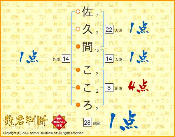 佐久間こころさんの人運は14画の1点!
