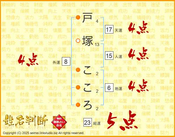 戸(4画)塚(13画) こ(2画)こ(2画)ろ(2画)