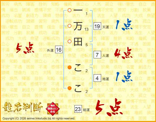 生活面を象徴する運勢です。外部から受ける影響力を表し、結婚運、家庭運や職場、環境への順応性を表します。総運から人運を引いた画数。姓や名が1文字の場合を除く。