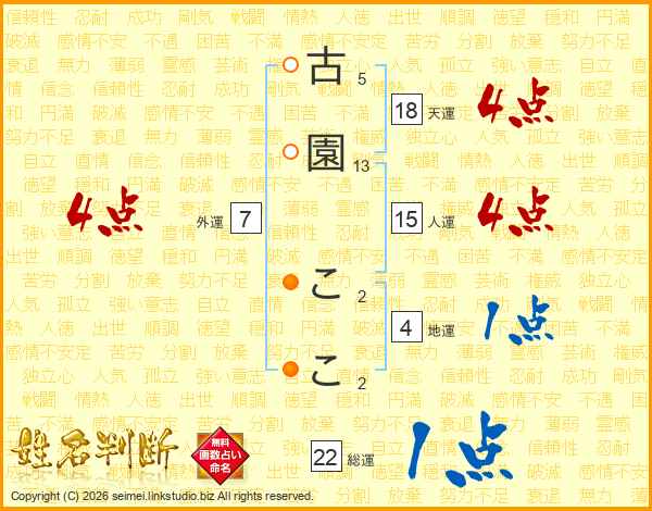 生活面を象徴する運勢です。外部から受ける影響力を表し、結婚運、家庭運や職場、環境への順応性を表します。総運から人運を引いた画数。姓や名が1文字の場合を除く。