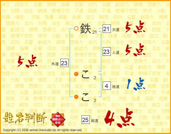 生活面を象徴する運勢です。外部から受ける影響力を表し、結婚運、家庭運や職場、環境への順応性を表します。総運から人運を引いた画数。姓や名が1文字の場合を除く。