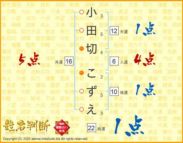 生活面を象徴する運勢です。外部から受ける影響力を表し、結婚運、家庭運や職場、環境への順応性を表します。総運から人運を引いた画数。姓や名が1文字の場合を除く。