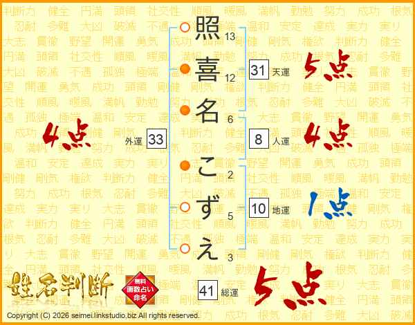 照(13画)喜(12画)名(6画) こ(2画)ず(5画)え(3画)