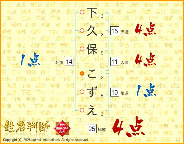 生活面を象徴する運勢です。外部から受ける影響力を表し、結婚運、家庭運や職場、環境への順応性を表します。総運から人運を引いた画数。姓や名が1文字の場合を除く。