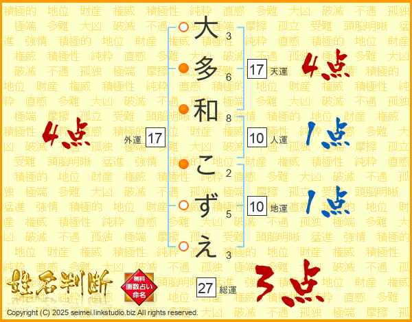 生活面を象徴する運勢です。外部から受ける影響力を表し、結婚運、家庭運や職場、環境への順応性を表します。総運から人運を引いた画数。姓や名が1文字の場合を除く。