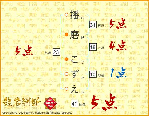 生活面を象徴する運勢です。外部から受ける影響力を表し、結婚運、家庭運や職場、環境への順応性を表します。総運から人運を引いた画数。姓や名が1文字の場合を除く。