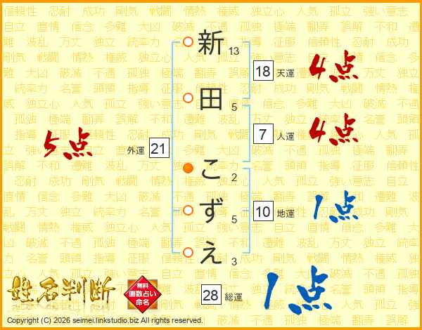 新(13画)田(5画) こ(2画)ず(5画)え(3画)