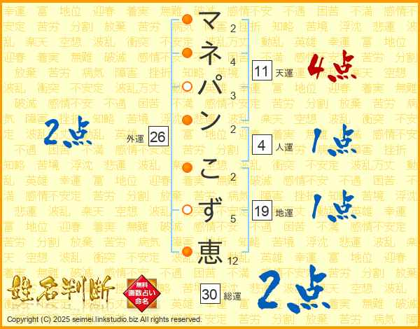 マ(2画)ネ(4画)パ(3画)ン(2画) こ(2画)ず(5画)恵(12画)