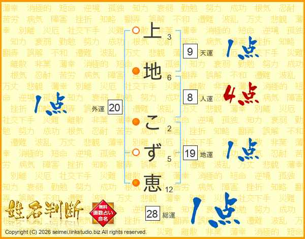 上(3画)地(6画) こ(2画)ず(5画)恵(12画)