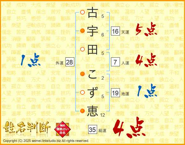 古宇田こず恵さんの総運は35画の4点!