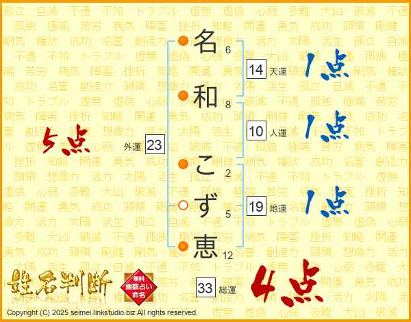 名(6画)和(8画) こ(2画)ず(5画)恵(12画)