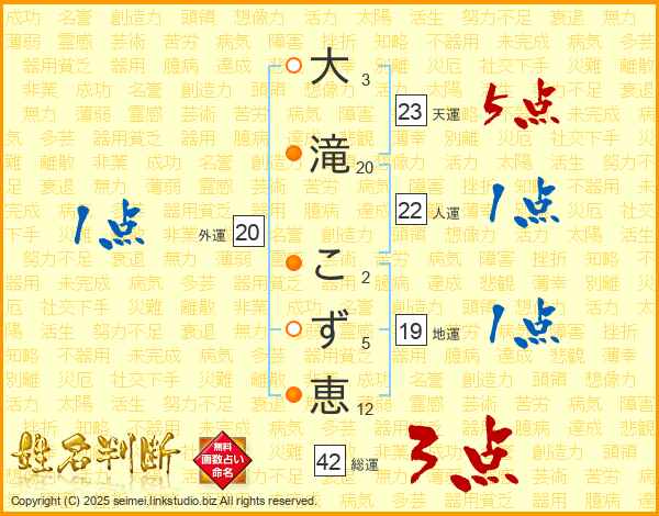大(3画)滝(20画) こ(2画)ず(5画)恵(12画)