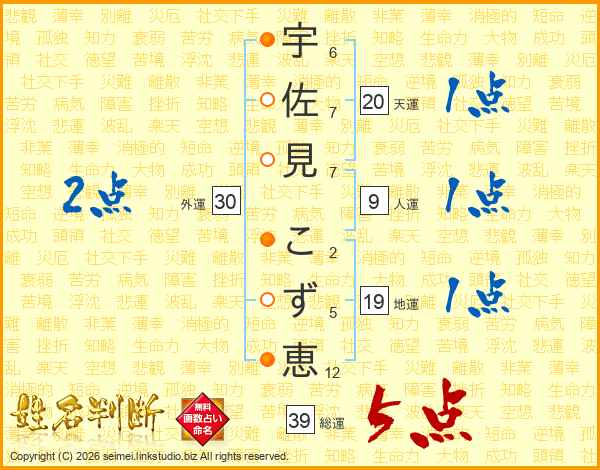 宇佐見こず恵さんの総運は39画の5点!