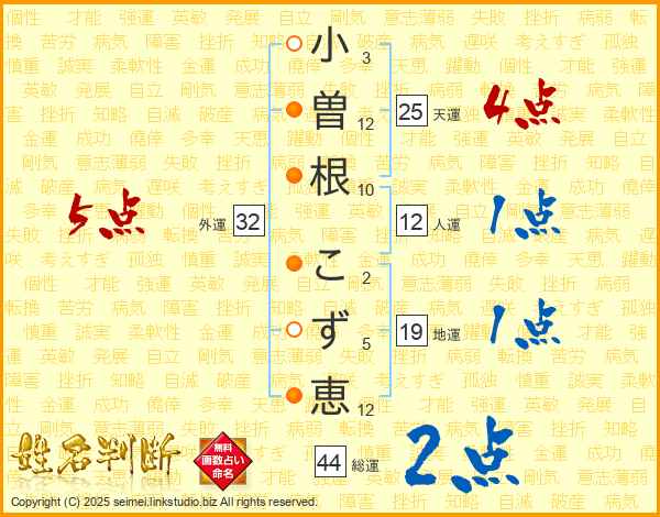 小(3画)曽(12画)根(10画) こ(2画)ず(5画)恵(12画)