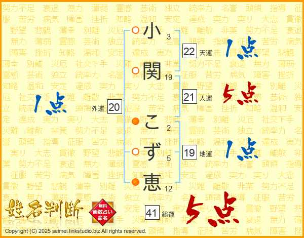 小(3画)関(19画) こ(2画)ず(5画)恵(12画)