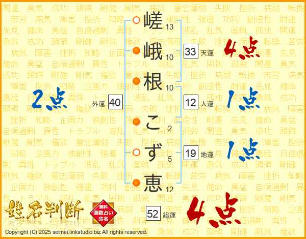 嵯(13画)峨(10画)根(10画) こ(2画)ず(5画)恵(12画)