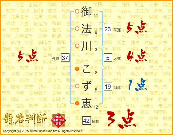 御(11画)法(9画)川(3画) こ(2画)ず(5画)恵(12画)